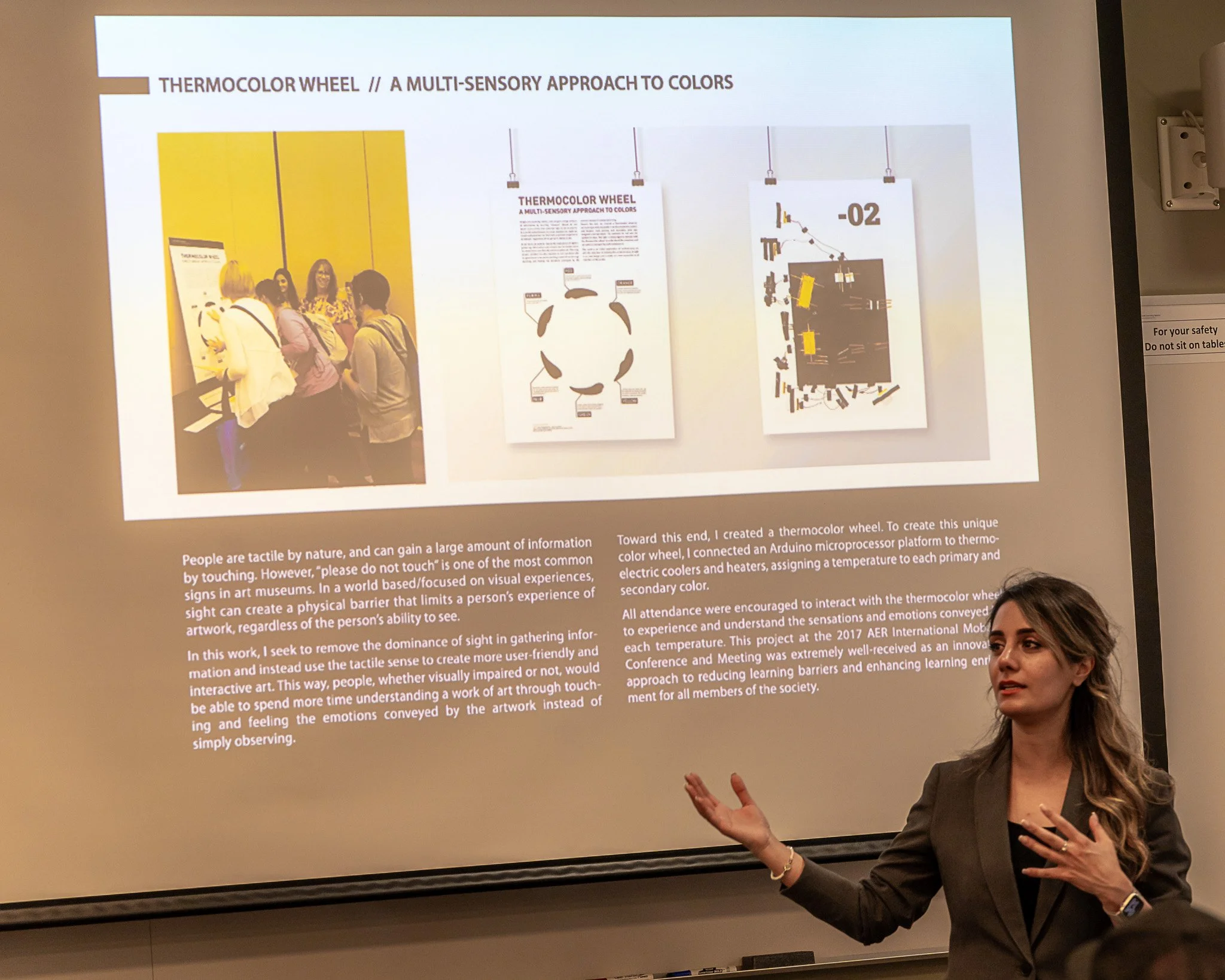 The Thermocolor Wheel invites visitors to experience color through touch. Using an Arduino microprocessor connected to thermoelectric coolers and heaters, each primary and secondary color is represented by sound and temperature. Presented at the 2017 AER International Mobility Conference, the project reimagined how tactile interaction can reduce learning barriers and enrich experiences for both sighted and visually impaired audiences.