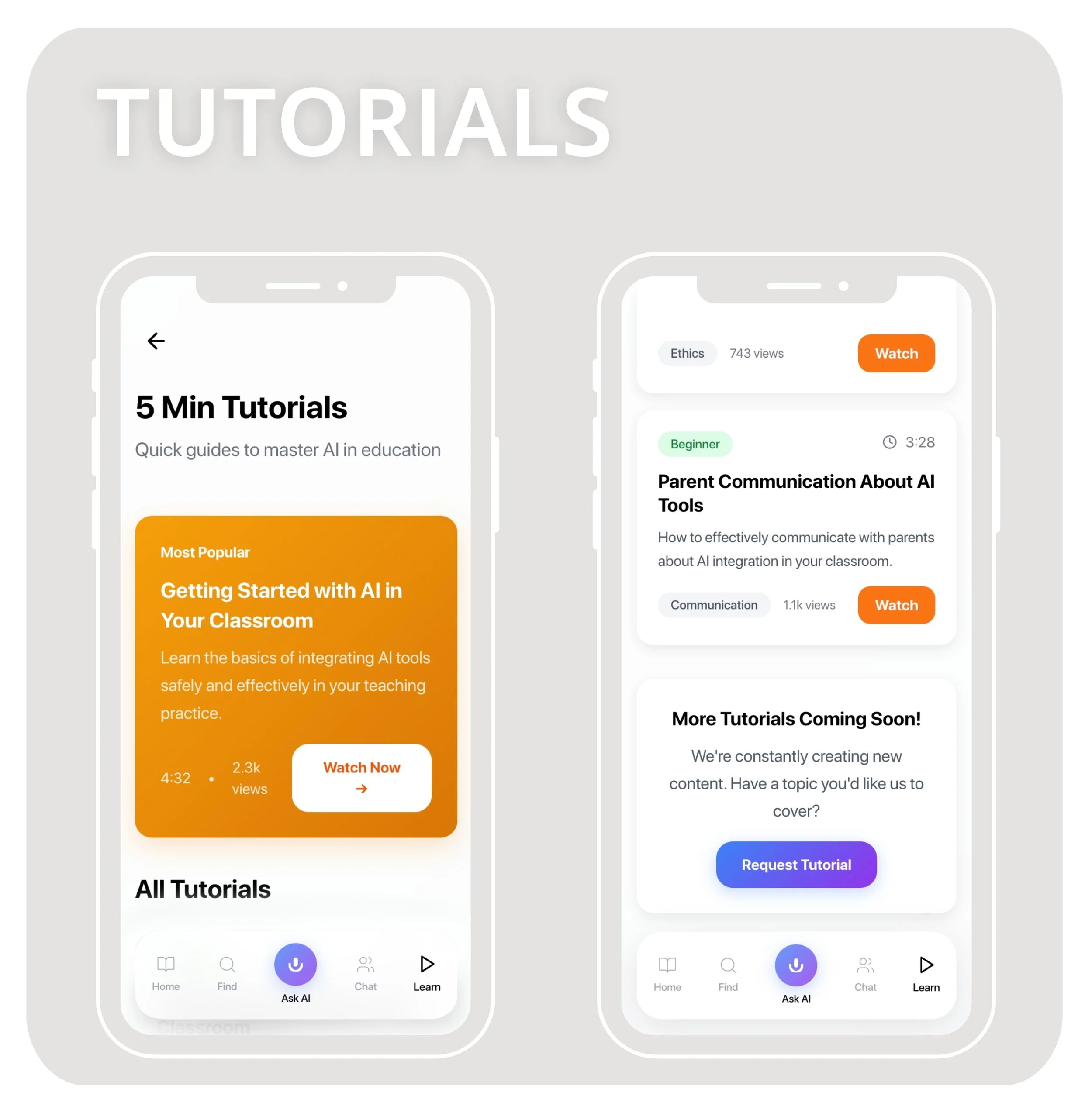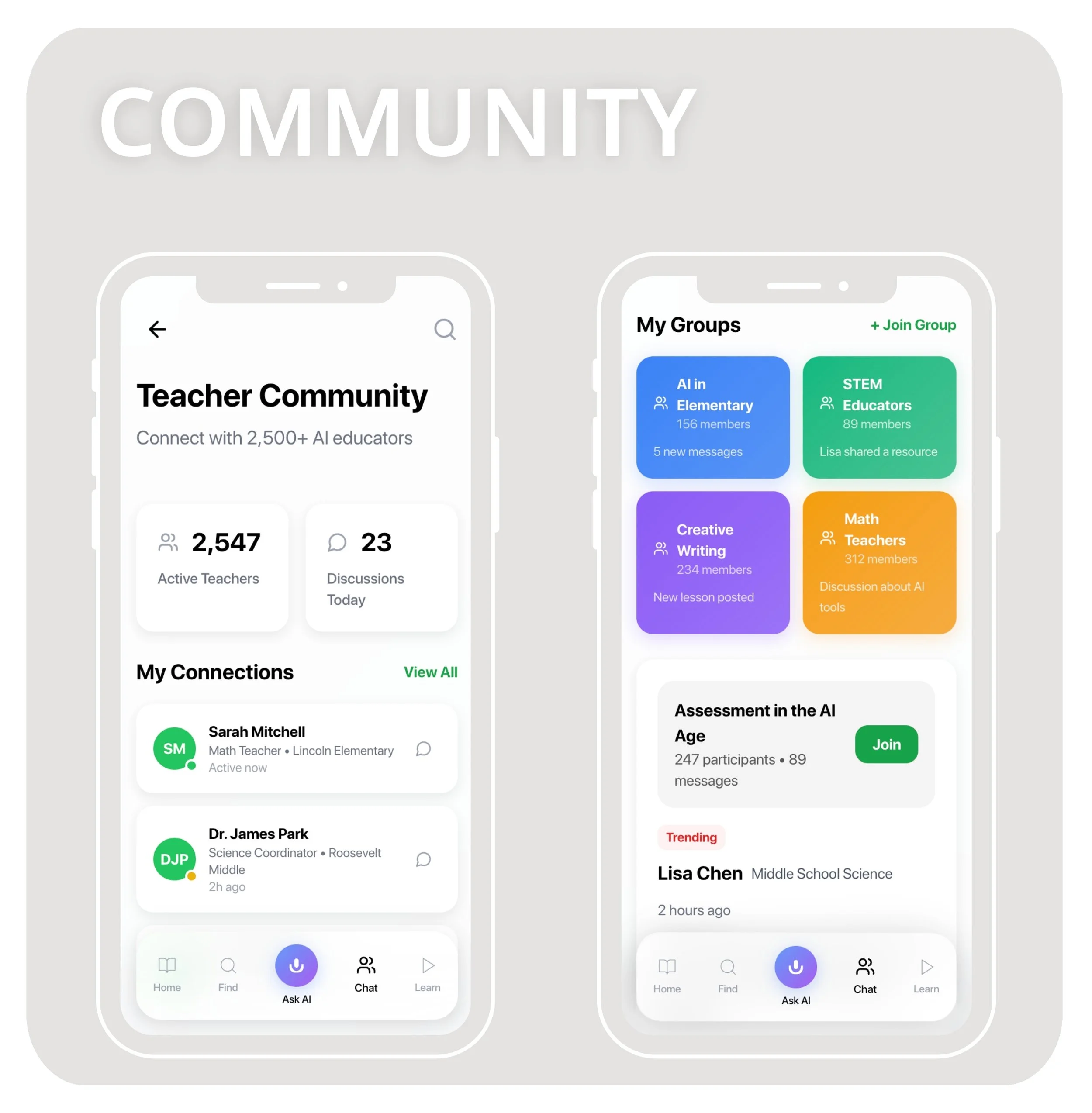 Each screen in the PEAK Education App is designed to simplify discovery, connection, and creativity for educators. From personalized dashboards to AI-powered lesson planning and tutorials, these five core sections illustrate a seamless learning ecosystem built around clarity, accessibility, and engagement.